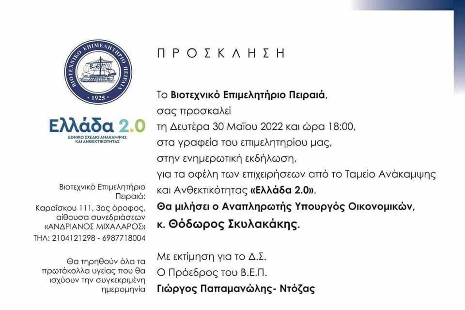 Το Βιοτεχνικό Επιμελητήριο Πειραιά, με αφορμή την έναρξη της διαδικασίας υποβολής επενδυτικών σχεδίων για χρηματοδότηση από το Ταμείο Ανάκαμψης, σας προσκαλεί τη Δευτέρα 30 Μαΐου 2022 και ώρα 18:00, στα γραφεία του, στην ενημερωτική εκδήλωση, για τα οφέλη των επιχειρήσεων από το Ταμείο Ανάκαμψης και Ανθεκτικότητας «Ελλάδα 2.0».