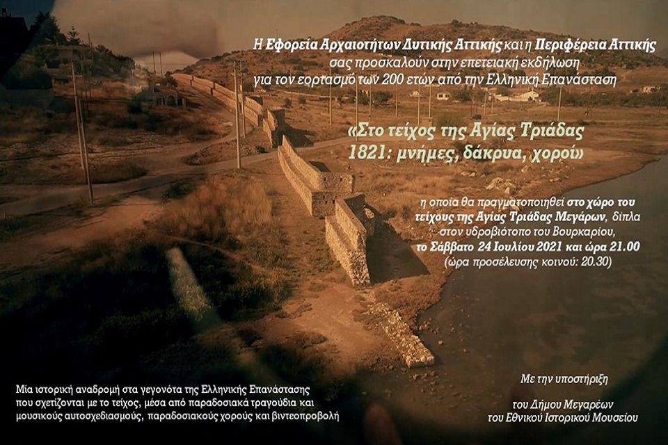 Στο πλαίσιο των δράσεων για τον εορτασμό των 200 ετών από την Ελληνική Επανάσταση, η Εφορεία Αρχαιοτήτων Δυτικής Αττικής, σε συνεργασία με την Περιφέρεια Αττικής, διοργανώνουν επετειακή εκδήλωση στο τείχος της Αγίας Τριάδας Μεγάρων, με τίτλο